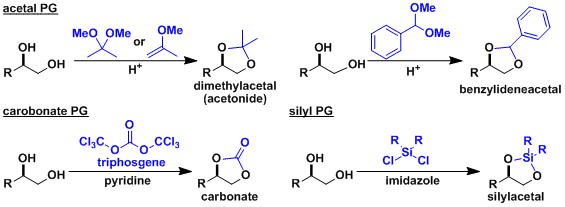 一般我们会把1,2-二醇或是1,3-二醇很容易的变成五元环或是六元环的形态从而把它们保护起来。