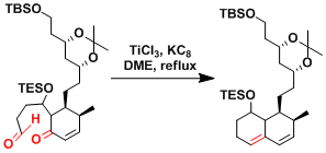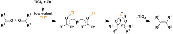 醛或酮在还原性金属和低价态钛的作用下两个羰基缩合去氧得到烯烃的反应。该反应可以被视为臭氧分解烯烃成羰基的逆反应。对于分子内反应也能够有效地进行,因此该反应经常被应用于合成大环化合物或者天然产物。
