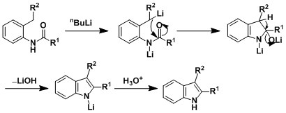 N-(取代)苯基酰胺与强碱在高温隔绝空气共热,发生分子内环化生成吲哚衍生物的反应。