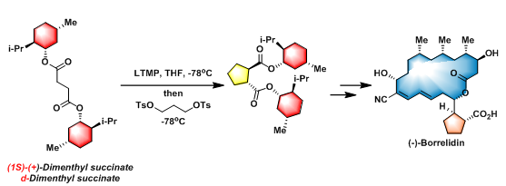 在-20 °C,氩气气氛下,将2,2,6,6-四甲基哌啶(2.5 eq.)的无水THF(0.7 M)溶液滴加至正丁基锂的正己烷(1.6 M, 2.5 eq.)溶液中,并将上述反应混合物搅拌20 min。后将上述反应液冷却至-78 °C,再加入光学纯度的琥珀酸二薄荷酯 (1.2 eq.)的无水THF (1.01 M)溶液,并维持在-78 °C下搅拌1 h。将产生的双烯醇负离子溶液滴加到1,3-丙二醇二对甲苯磺酸酯(1 eq.)的无水THF (0.85 M)溶液中。将上述反应液在-78oC下搅拌3 h后,加入2-甲基丙醛(3.6 mL)淬灭过量的烯醇负离子。再将上述反应液中加入用冰冷却的1 M HCl淬灭反应,并采用乙醚萃取。合并的乙醚相采用无水硫酸镁干燥,真空除去溶剂。将浓缩液通过短硅胶柱除去极性副产物(正己烷/EtOAc 40/1 v/v),再将滤液浓缩,并进一步通过硅胶柱色谱(230-400目,正己烷/EtOAc 40/1 v/v)进行分离纯化,获得最终目标产物。
