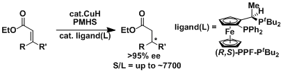 Lipshutz等人也进行了一些列的不对称反应的研究。他们开发出了在温和条件下,利用极少催化量的催化剂催化的不对称1,2-/1,4-还原反应。最近他们还成功开发出了低反应性的α,β-不饱和酯的不对称还原反应。[2]。