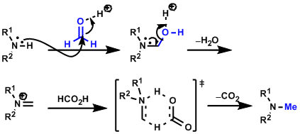 该反应是一级或二级胺通过与甲酸和甲醛反应后在氨基N上进行的N-甲基化的反应。该反应通常用于合成