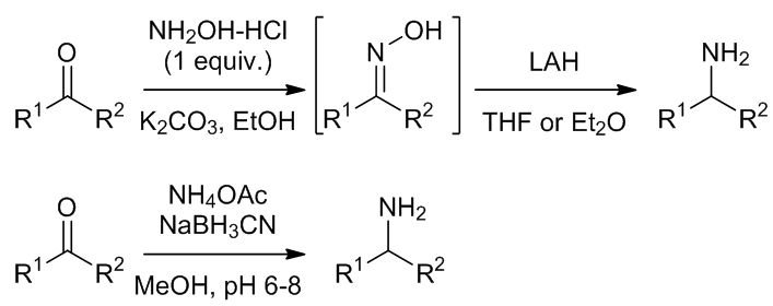第一个反应式:这是一个非直接的得到胺的方法,它可以有效的防止生成肟之后的多烷基化。这一步生成的肟中间体非常稳定,它不会因为反应的可逆性而会发生分解,因此过过程中也不需要除去生成的水。