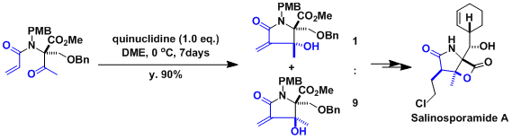 Salinosporamide A 的合成[1]:根据分子内Baylis-Hillman反应、合成得到邻位不对称季碳中心。