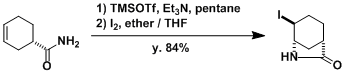 使得γ,δ-不不饱和羧酸与碘反应,进过形成碘嗡离子中间体后再内酰化的反应。该反应能在温和条件下进行,并且能够得到位置及立体选择性的内酰化产物。