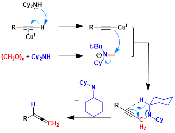 在铜金属催化剂、多聚甲醛、高位阻2级胺(二环己胺、二异丙胺等)存在下,把末端炔烃转换成联烯的手法。