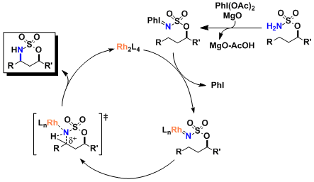 利用二价Rh催化剂在反应体系中形成金属氮宾进行的C-H活化胺基化反应的手法。该方法对烷烃的惰性C-H进行直接胺基化官能团化来说是十分优异的手法。
