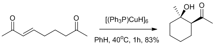 [(Ph3P)CuH]6是一种性质温和的还原剂,也被称为Stryker试剂,在1961年被开发之后成为了一种可以还原多种α, β-不饱和羰基的试剂,之后开发成为了商业化的试剂。反应过程中需要使用5-20 equiv.的水以防止副反应的发生。此外,当反应中加入化学计量的nBu3SnH,PhSnH3或PMHS时,可以提高反应的效率4。反应机理5, 6, 12-15: