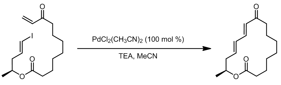 这个反应的中间体有两个β-H,但是和Pd的cis-H却只有一个,因此在发生还原消除的时候,只会有一种产物专一的生成,好似发生了双键的迁移。这个反应未使用配体,而是用季铵盐作为代替,这也被叫做Jeffery-Heck反应,在这些条件下,反应在DMF或DMSO中室温下即可发生,季铵盐可能是通过还原消除将Pd试剂还原到0价的试剂,并且抑制了烯烃的异构化作用。