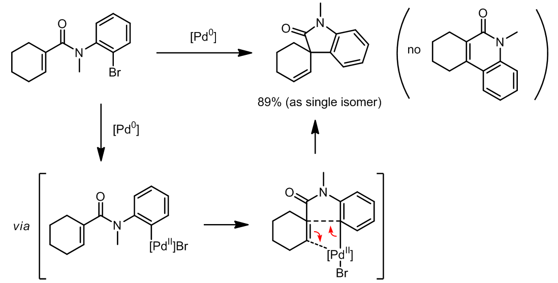这个例子说明,β-消除和氢钯加成是一个热力学平衡,这可以使得π-配合物被亲核试剂进攻而成环新城最终产物。