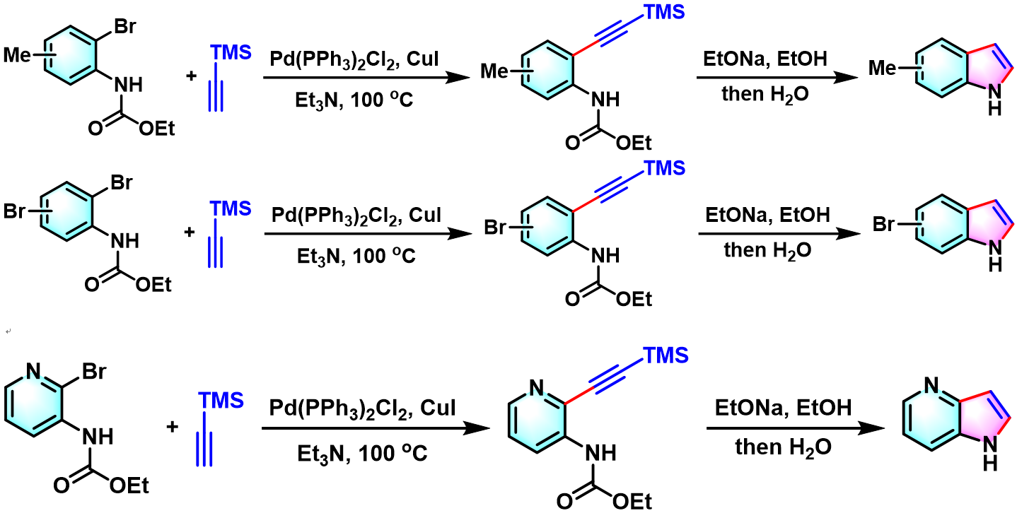 1987年,Yamanaka对该反应进行了更为深入的研究,发现各类取代邻卤苯胺在该反应条件下均能够以良好的收率获得相应吲哚类化合物。同时,Yamanaka研究表明,该反应条件对于卤代杂环芳胺同样适用[2]。