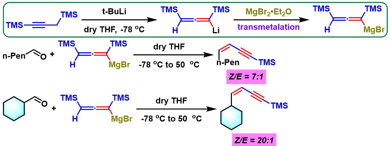 之后, Yamamoto通过加入溴化镁与联烯基锂试剂进行转金属化(transmetalation)过程,形成的联烯基镁试剂再与醛或酮反应,研究表明可以获得更高程度的(Z)-选择性。