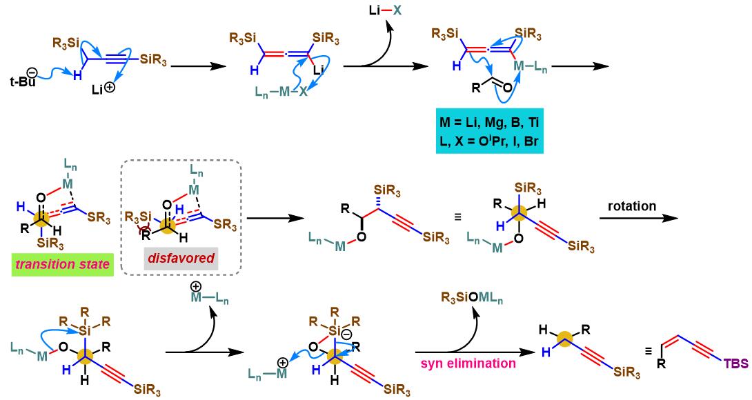 1982年,Yamamoto课题组进一步采用四异丙氧基钛、三异丙氧基硼分别与联烯基锂及由α-硅基乙腈形成的锂试剂进行转金属化 (transmetalation)反应,发现生成的相应硼及钛试剂同样可以参与上述反应,并以较好的立体选择性获得(Z)-烯炔及(Z)-α, β-不饱和腈类化合物[2]。