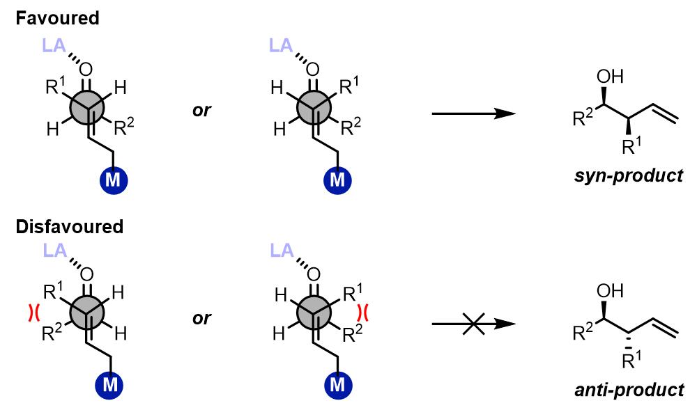 根据烯丙基双键的不同构型得到syn/anti-不同的产物,烯丙基化大致有三类:第一类是E构型得到反式产物,Z构型得到顺式产物,此类反应通常金属试剂为烷基硼试剂,硅试剂和锡试剂等,反应过程是六元环过渡态。第二类是烷基锡试剂和硅试剂等,无论什么构型的双键都会得到顺式产物,反应机理是非环状过渡态;第三类是使用铬试剂、钛试剂和锆试剂等的反应,反应经理六元环过渡态,产物是立体专一的反式产物。