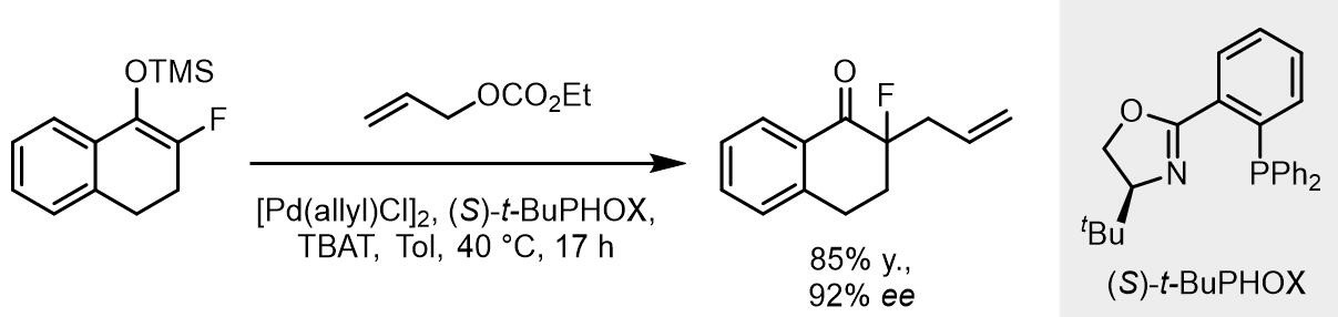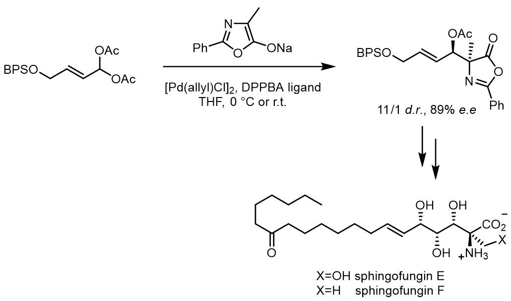 对于金属试剂作为亲核试剂的不对称烯丙基烷基化,例如有机锌试剂和有机镁试剂,Pd催化的效果一般不太好,但是酮和酯的烯醇负离子的反应可以做到较好的立体化学选择性。往往这类反应会生成两个手性中心,而亲核试剂片段上的手性比较难以控制。