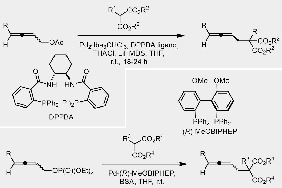 从烯丙基类化合物到联烯的转化在天然产物的合成中使用较多,目前有两种比较主流的方式,分别是从联烯底物和共轭丁二烯底物。氧化加成后得到的烯丙基配合物可以和软亲核试剂在位阻较小的碳原子上发生取代反应, 并且此类反应可以用于发展动力学拆分反应。