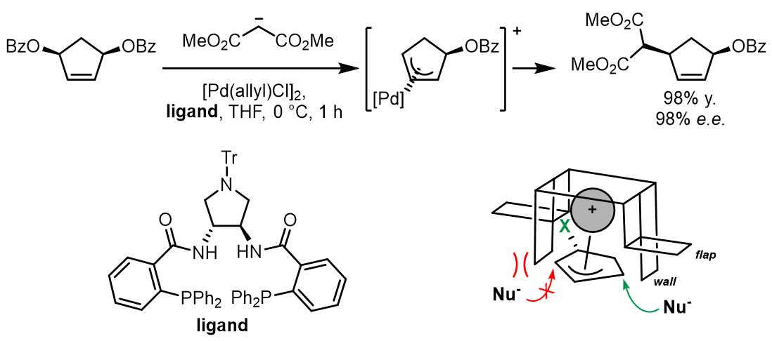 若使用不对称的配体,生成的烯丙基配合物可以在endo-和exo-配合物快速异构化,理论上会有四种不同的反应途径,但是此类配体可以得到高度立体专一的不对称取代反应的产物。