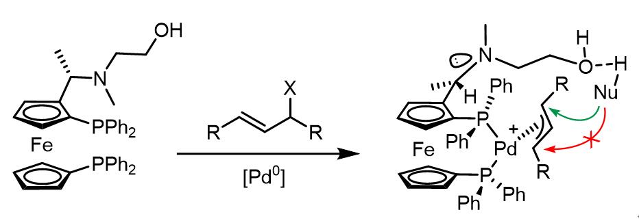 利用羟基和亲核试剂之间的氢键作用可以使得设计出一类二茂铁催化剂配体以完成高度选择性的烯丙基取代反应: