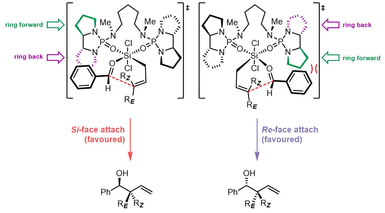 反应的立体化学选择性可以用以下模型解释,硅试剂可以从Si面进攻,但是椅式过渡态可以使得烯丙基硅试剂从Re面进攻,苯甲醛的位置在左侧可以避免和吡咯环的相互作用,因此这是更加有利的过渡态: