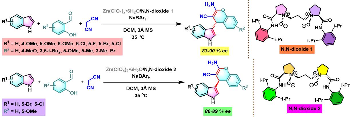 同时,X. Feng通过手性N,N-二氧化物与锌盐原位生成的N,N-二氧化物/锌(II)配合物催化剂,首次实现芳香醛、吲哚和丙二腈之间的对映选择性三组分一锅缩合[11]。