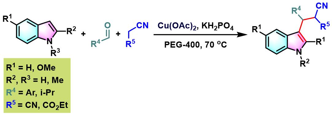 2012年,S.Chandrasekhar与R. Greé发现,在PEG-400及乙酸铜催化剂存在下,能够更为有效地实现各类芳香醛与吲哚及丙二腈或氰基乙酸酯之间的三组分缩合。反应过程无需额外添加其他配体[13]。