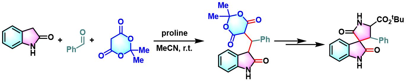 1978年,日本Hokkaido大学药学部(Faculty of Pharmaceutical Sciences, Hokkaido University, 北海道大学薬学部)的Yonemitsu(米光 宰, Yonemitsu Osamu)研究室首次报道了使用有机催化剂脯氨酸实现Meldrum酸、乙醛与吲哚之间的三组分一锅缩合反应,成功完成3-取代吲哚衍生物的合成[1]。