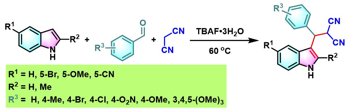 此外,K. N.Singh研究表明,通过TBAF催化剂,同样能够有效地完成芳香醛与吲哚及各类活泼亚甲基化合物在无溶剂条件下的三组分一锅缩合[16]。