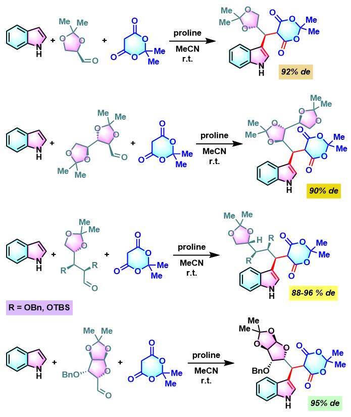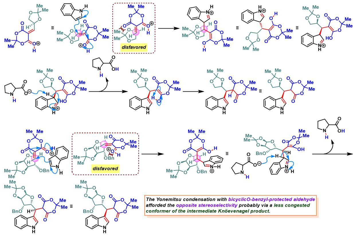 之后,该课题组对其它各类糖衍生的手性醛与吲哚、Meldrum酸之间三组分缩合进行了系统的研究,发现上述缩合过程具有良好的产率与较高的非对映选择性[4]。此外,作者还对反应机理进行了深入研究。