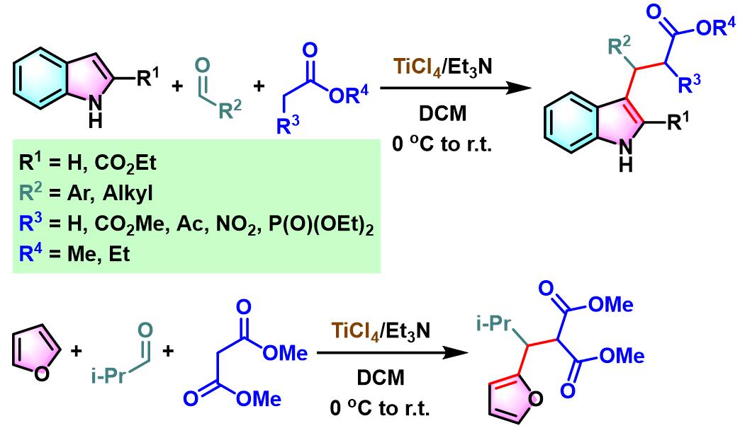 2008年,S. Gérard与J.Sapi研究发现,采用TiCl4/Et3N试剂,能够将底物范围扩展至其它取代吲哚或活泼亚甲基化合物[8],从而进一步拓宽了该方法学的应用范围。同时,S. Gérard与J.Sapi发现该试剂同样适用于呋喃、醛与丙二酸酯之间的三组分一锅反应[8]。