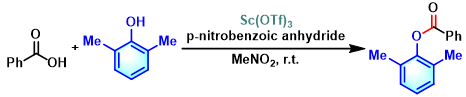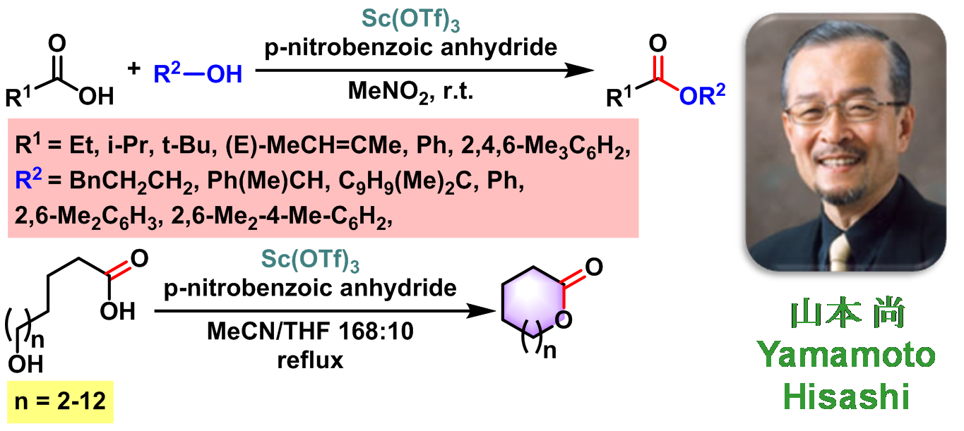 Yamamoto酯化 (Yamamoto esterification)是在Lewis酸催化剂三氟甲磺酸钪以及对硝基苯甲酸酐存在下,羧酸与一级、二级以及三级醇或酚之间进行的分子间或分子内酯化反应[1]-[4]。该反应由日本Nagoya大学工学院 (名古屋大学工学研究科, Graduate School of Engineering, Nagoya University)的Yamamoto (山本 尚, Yamamoto Hisashi)研究组在1995年首次报道[1]。同时,由于Yamamoto酯化过程能够有效地应用于ω-羟基羧酸底物的选择性内酯化过程,并可以成功完成一系列大环内酯类化合物的构建。因此,上述反应又称为Yamamoto大环内酯化 (Yamamoto macrolactonization)。