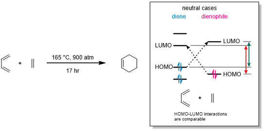 从前线轨道理论来看,DA反应的实质是双烯体和亲双烯体之间的轨道作用,因此两者的电子环境对于反应至关重要,而底物上的取代基又会对电子密度产生直接的影响,因此取代基效应对于反应的结果有非常强烈的反馈。我们可以反应条件和反应速率来作为粗略的量度说明这个问题,首先是双烯体和亲双烯体上均没有取代基的反应,反应165oC高温和900 atm下需要17小时可以达到平衡: