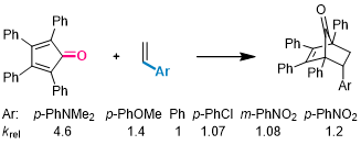 当亲双烯体上有多个吸电基团时,相对反应速率可以以指数级别增长: