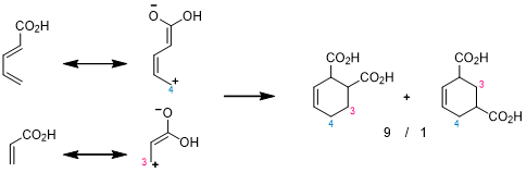 但是这个方法不能在所有的情况下推广,例如(Z)-1, 3-戊二烯酸和丙烯酸的反应中,上述理论使得双烯体的C4和亲双烯体的C3带有正电性,这样的反应中产物应该以间位产物居多,但是事实上邻位产物位主产物,占比90%: