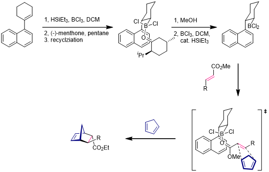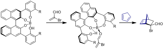 在2002年,Corey课题组报道了一种新型的非常有效的用于催化不对称DA反应的硼试剂[1-5],这种硼试剂对反应底物具有非常广阔的适应性,可以用于多种不饱和羰基化合物的DA反应,而对于二烯则同时适用于环状和非环状二烯底物: