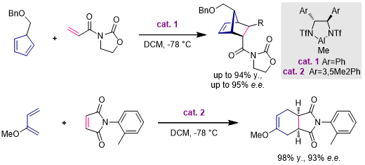 第一例铝试剂催化的不对称DA反应由Koga报道了手性薄荷醇衍生物铝试剂实现,但是这种催化剂只对1,1-二取代的烯烃底物效果较好[11]: