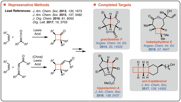 环丁烷的骨架广泛存在于天然产物分子中。Brown教授小组致力于开发催化剂控制烯烃与丙二烯或杂丙二烯的立体选择性[2 + 2]环加成反应。Brown教授小组开发的立体选择性[2 + 2]环加成反应要么直接用于生物活性分子构建6-8,要么间接用于快速构建多种复杂性分子的多环框架6,9-11(图1)。