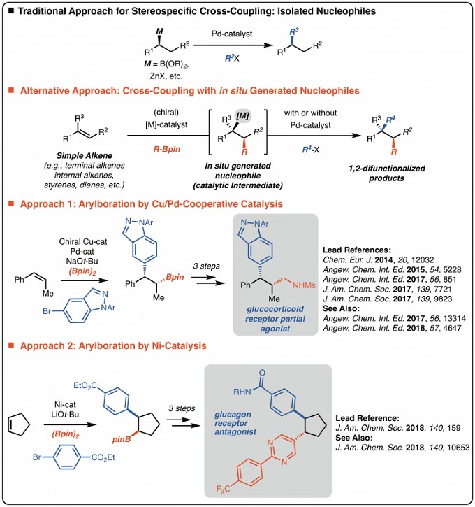 过渡金属催化的交叉偶联反应在重要分子化学合成中的价值不可低估。在这一领域,Brown的实验室主要关注两个方面:1) 铜催化的铃木型交叉偶联/间断交叉偶联;2) Csp3-亲核试剂的立体选择性交叉偶联反应。
