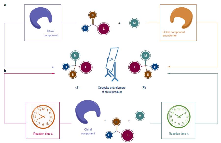 在不对称合成中,反应时间也是个重要参数,特别是在动力学拆分Kinetic resolution (KR)中,利用反应速率的不同,一种构型参与反应,另一种一种构型不反应或反应速率很慢,产物不同从而将两者分离。但即使反应彻底,最高只有50%的转化率。还有种策略为平行动力学拆parallel kinetic resolution(PKR),两个构型分别发生不同的反应,各生成对应的产物,进行分离。虽然动力学拆分和时间有关,但手性试剂或催化剂起决定性作用。