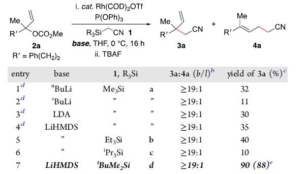 初始条件,使用四级烯丙基碳酸酯2a和(三甲基硅基)乙腈TMSAN1a作为底物,在三苯基氧膦和铑催化剂Rh(COD)2OTf作用下,生成了支链产物3a,以及少量的直链产物4a,虽然区域选择性很好,但收率仅为32%,因此,作者考察了不同碱对反应的影响,常规碱的sBuLi、LDA、LiHMDS效果都不好,而且产物3a也没有出现聚烷基化产物,因此前亲核试剂的稳定性可能是关键,作者继续考察乙腈的代替物,实验发现,硅烷基的立体立体位阻越大,收率越高,如(三叔丁基硅基)乙腈1d的效果最好,收率提高至90%。表 1列举了区域选择性的条件。