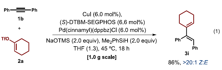 首先,作者采用1-苯基-1-己炔1a与1-环己烯基三氟甲磺酸酯2a作为模型底物,进行相关氢烯基化反应条件的优化筛选 (Table 1)。进而确定最佳的反应条件为:采用CuI作为铜催化剂,Pd(cinnamyl)(dppbz)(Cl)作为钯催化剂,(S)-DTBM-SEGPHOS作为配体,Me2PhSiH作为氢源,NaOTMS作为碱,THF作为反应溶剂,反应温度为45oC,最终获得80%收率的氢烯基化产物3a。